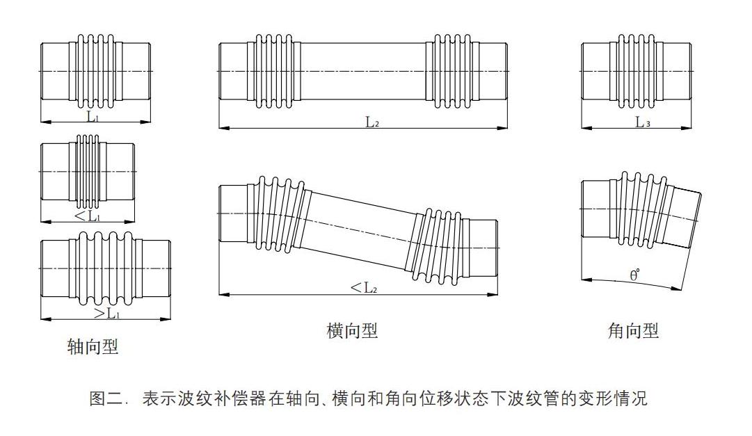 以上是波纹补偿器的基本位移形式,实际使用中有许多产品形式,都是利用波纹管作为核心的挠性元件,结合具体管线的位移情况,设计出具有特定功能的机械结构,从而制造出功能各异的补偿器产品。