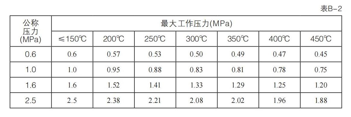 表格中标注的公称压力是指150℃时的公称压力,若管系的工作温度不是150℃,则补偿器的最大工作压力可按表B-2中的数值选取。