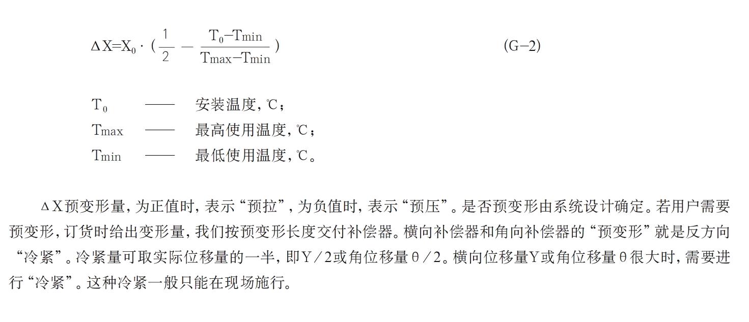 为了使补偿器处于一个良好的工作位置和减小支架受力,可对补偿器在安装前进行“预变形”。轴向型补偿器的预变形量△X由下式(G-2)确定: